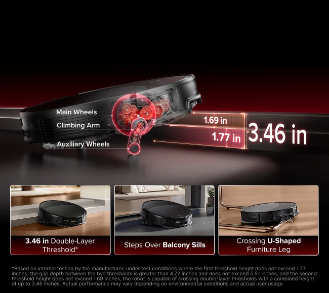 Roborock claims support for double thresholds up to 8.8cm total, with roughly 4.5cm for the first step and 4.3cm for the second. In employee testing, it also cleared aggressive single-threshold challenges better than expected, reportedly handling 4.1cm and even 5.0cm obstacles in some cases before finally reaching its limits closer to 6.0cm.